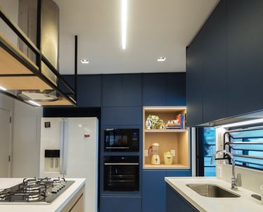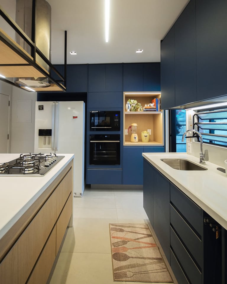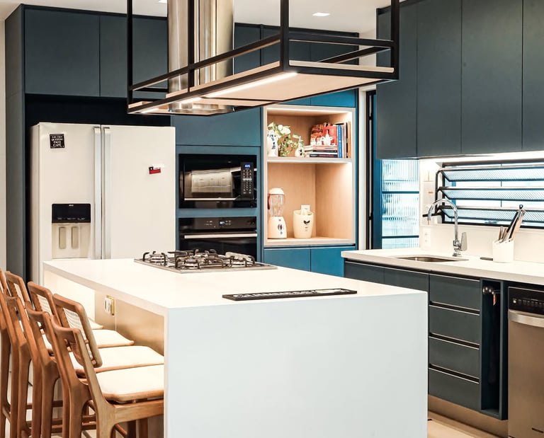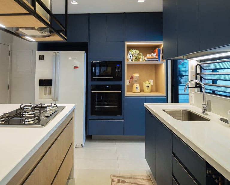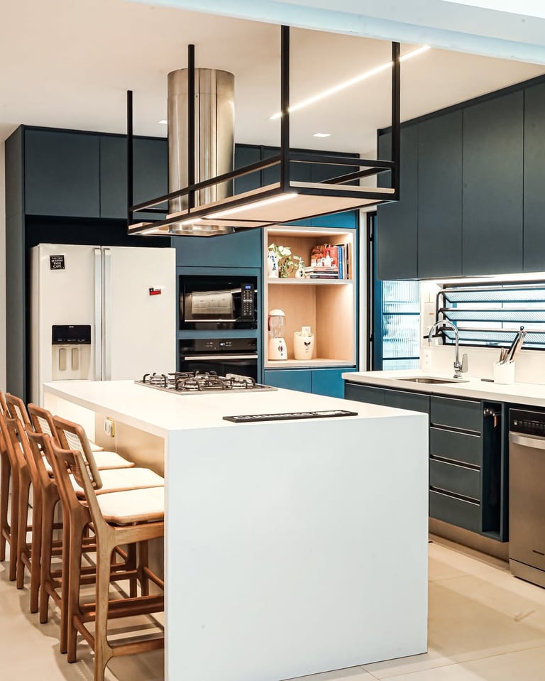 Esta cozinha projetada pela arquiteta Gisele traz o azul como protagonista, criando um ambiente moderno e acolhedor. O equilíbrio perfeito entre funcionalidade e estética.